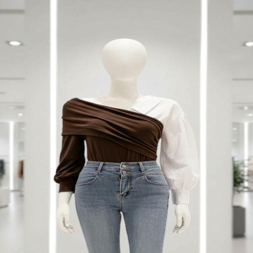 [비바앤코코넛]언발 배색 셔링 카라 오프숄더 셔츠