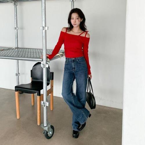 [에이치플러스몰]언밸런스 숄더라인 포인트 오프숄더 니트 티셔츠