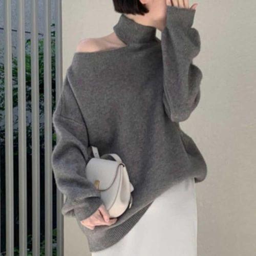 [에이치플러스몰]한쪽 오프숄더 목폴라 니트 루즈핏 세련 소매 시보리