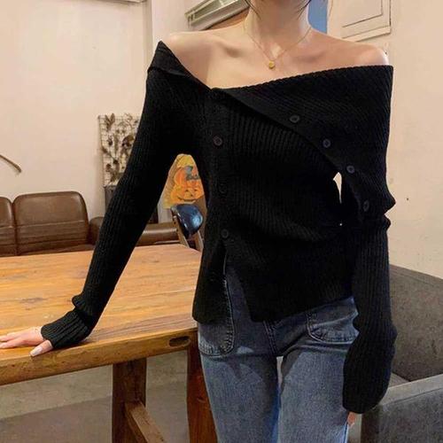 쪼예 네츄럴 언발 오프숄더 슬릿 버튼 긴팔 니트 티셔츠