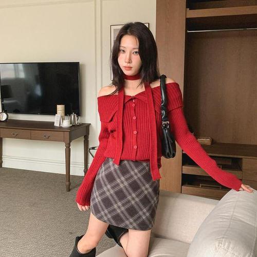 [옷자락]여성 무지 컬러 레이어드 스퀘어넥 오프숄더 니트