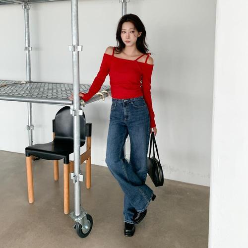 cammello 허리 트임 포인트 오프숄더 골지 니트 티셔츠