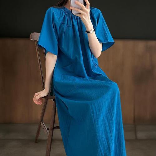 [신상오픈런]여성 리본넥 큰사이즈 두 포켓 오프숄더 블루 롱드레스 (33305987)