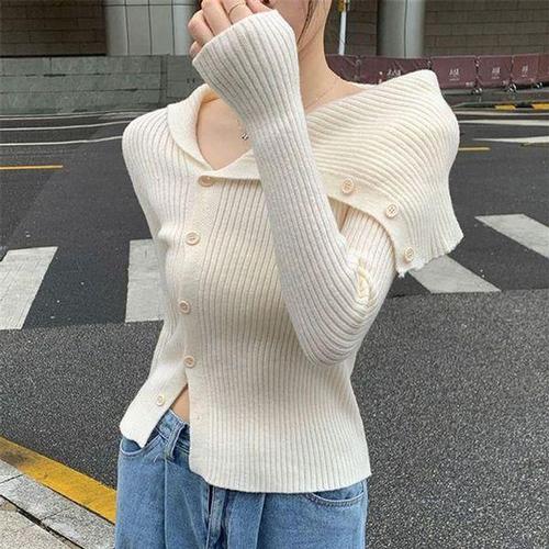 [로코엘라]마리 셔츠 카라 레이어드 오프숄더 니트