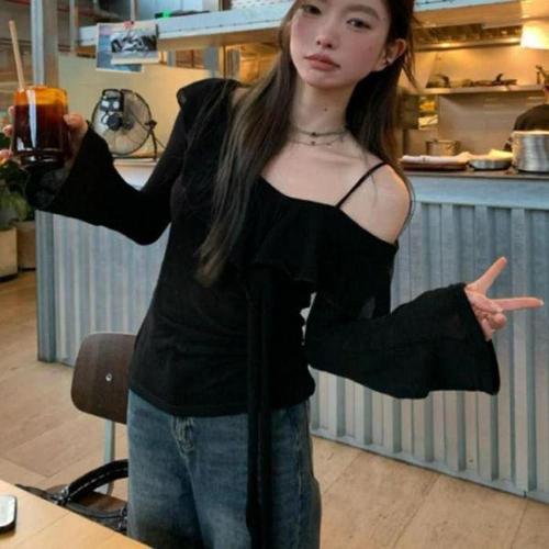 [셀러허브_여성트랜드패션]Rly 간절기 오프숄더 리본 타이 여성 프릴 긴팔 티셔