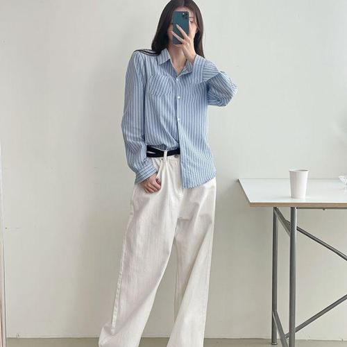 상상그이상 여성용 마린 세로줄 스트라이프 기본 셔츠