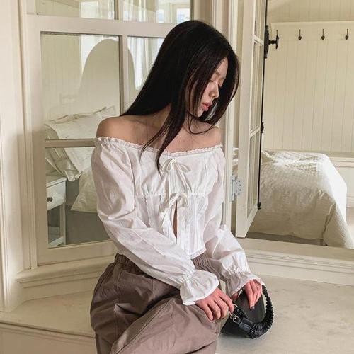 [신상오픈런]오프숄더블라우스 리본끈 여성 긴팔 중세풍 코르셋 셔링 (29759638)