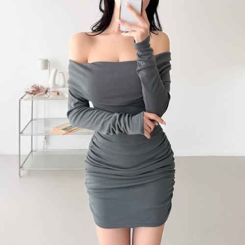 [옷자락]여자 무지컬러 셔링 기모 오프숄더 미니 원피스