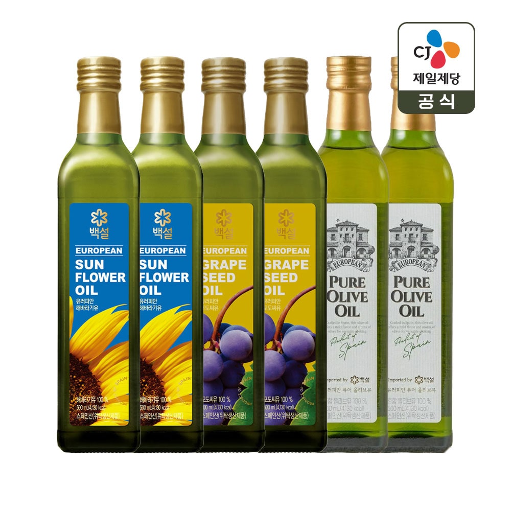 백설 유러피안 조리유 500ml 3종 세트(포도씨유x2+해바라기유x2+퓨어올리브유x2)