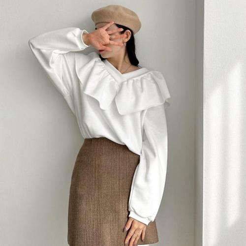[다잇템]여자 빅프릴 브이넥 블라우스 가을긴팔 티셔츠