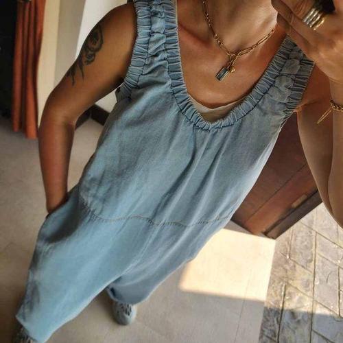 ORZQU 여성 데님 멜빵바지 포켓 캐주얼룩 빅사이즈 와이드 워싱 데님 9부 점프수트