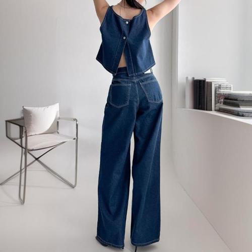 [신상오픈런]크롭 데님조끼 플리츠 논스판 와이드데님팬츠 투피스 (30551392)