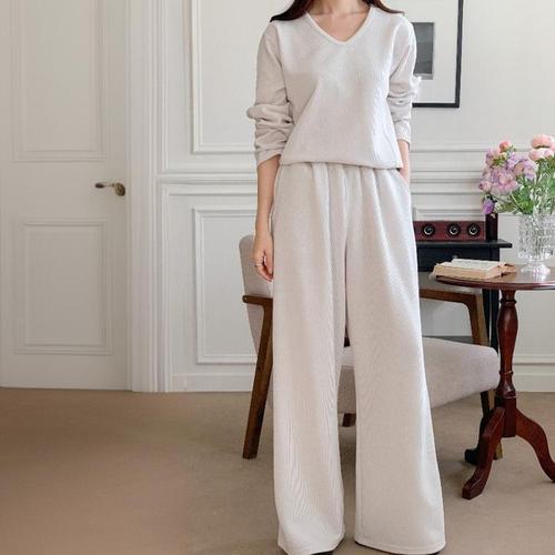 [신상오픈런]브이넥롱티 검정색 골지 와이드팬츠 투피스 오버핏 (29735398)