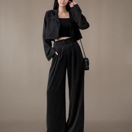 [신상오픈런]여성 크롭 블랙 재킷 핀턱 맥시 와이드핏 투피스 세트 (41316114)
