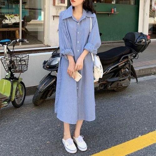 [모노무드]LMO 데일리 줄무늬뒷밴딩 머스트해브 와이셔츠 원피스룩