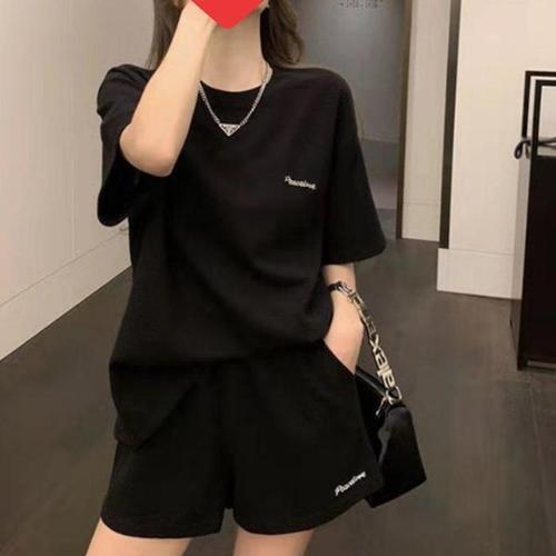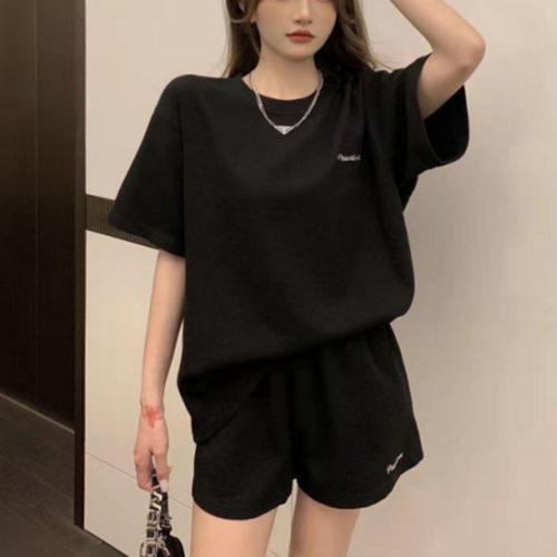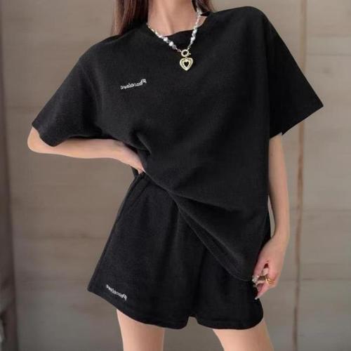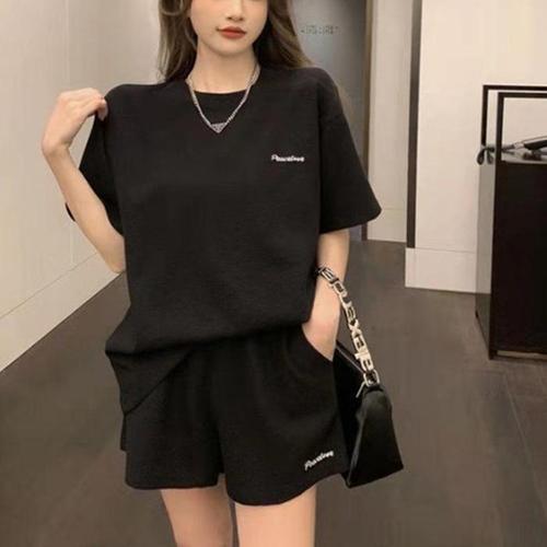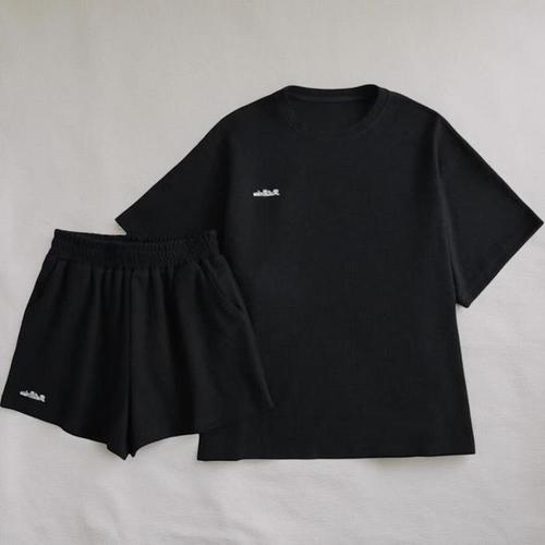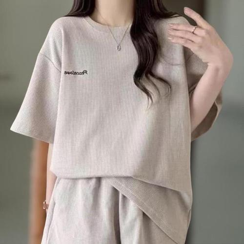 [신상오픈런]여성 심플 레터링 와플 찰랑핏 반팔 티셔츠와 반바지 세트 (40953016)
