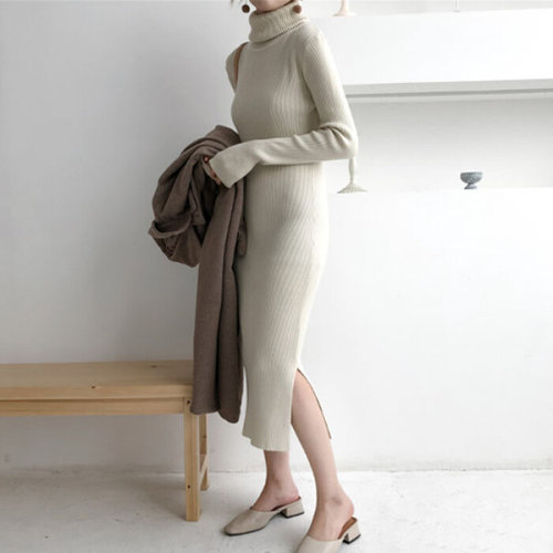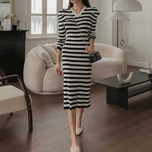 슈팅스타 / 슬림 우아한 브이넥 타이트 골지 롱 니트 원피스