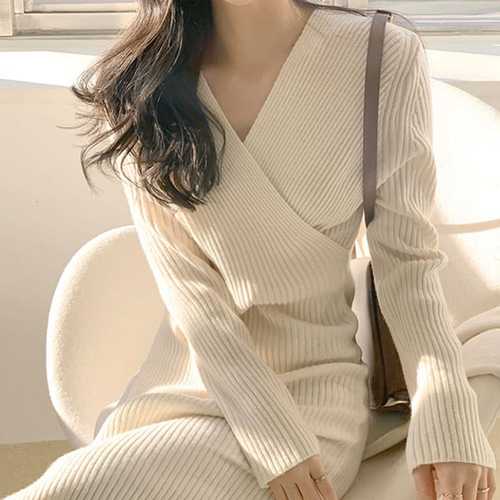 슈팅스타 / 우아한 브이넥 골지 크로스 간절기 봄 니트 원피스