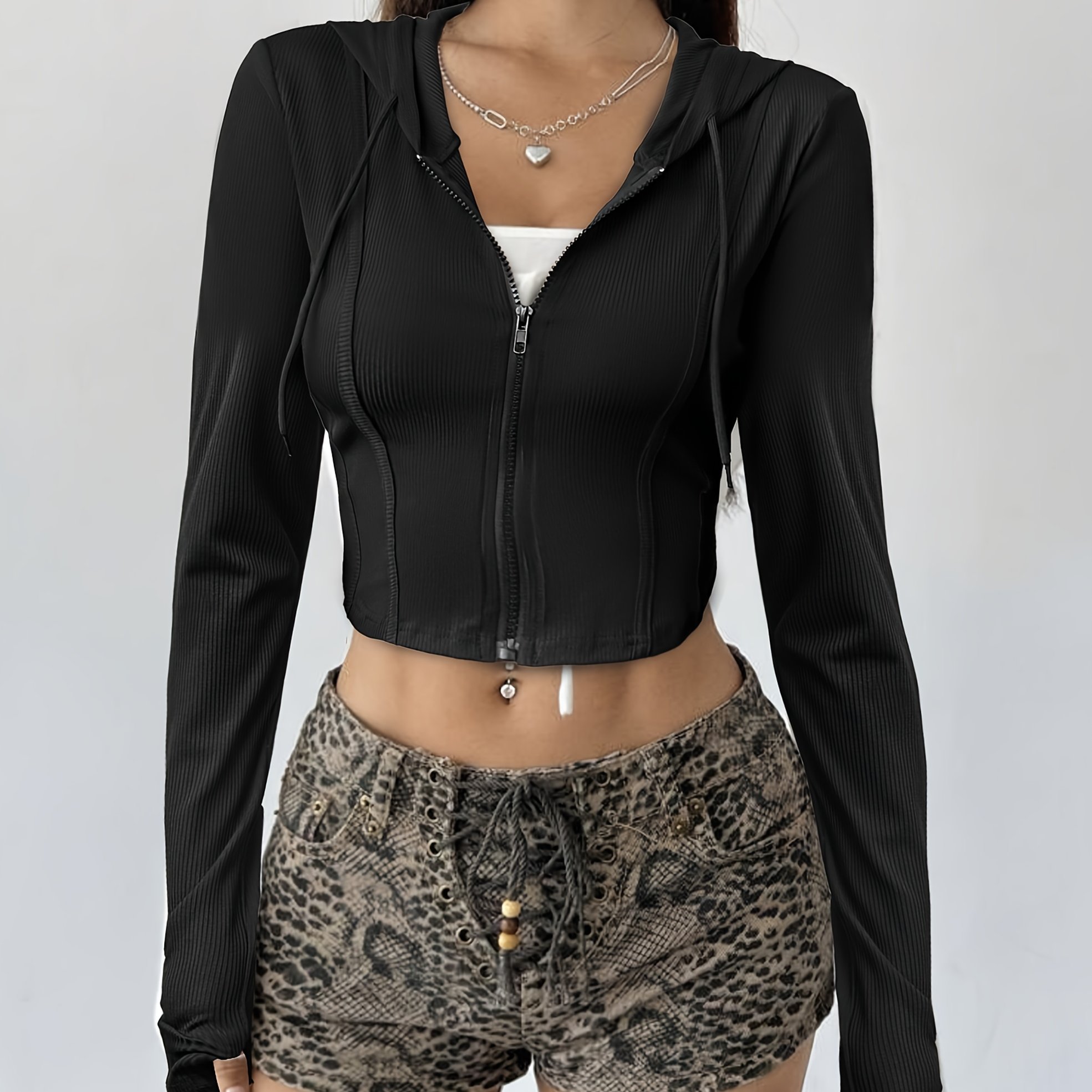 TEMU 솔리드 드로스트링 지퍼업 보온 안감 크롭 후드티