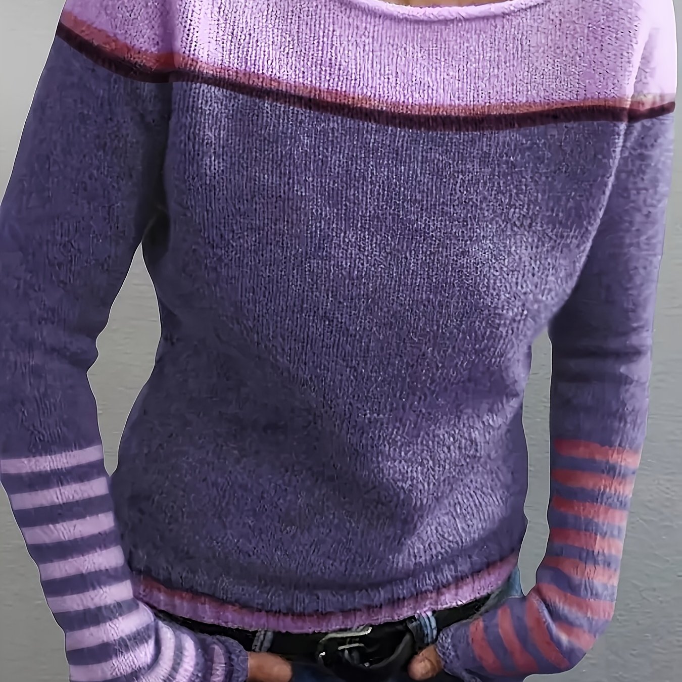 TEMU 여성용 빈티지 오버사이즈 라인 스웨터 - 루즈핏 컬러블록 스웨터, 가을/겨울용, 긴 맥시 기장 라운드넥 밑단 풀오버, 레이어링용 캐주얼 엘레강스 스웨터 (손세탁 가능)