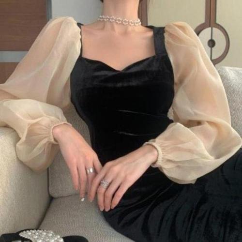 [다잇템_패션]여성 벌룬소매 롱 벨루어 코디 핏 원피스