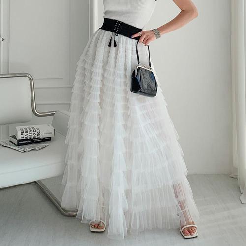 TEMU 우아한 화이트 러플 밑단 롱 스커트 | 단색, 하이웨스트, 플레어 A라인, 봄/여름용 케이크 스커트