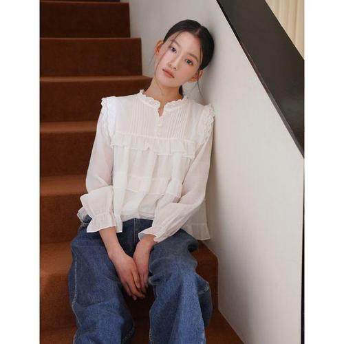 [위시드]핀턱 라인 프릴 소매 버튼업 페미닌 블라우스 (WIAABL233)