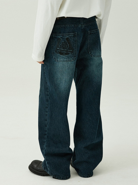 [맥우드건] 파번 7546 홀스슈 자수 와이드핏 다크인디고 데님팬츠