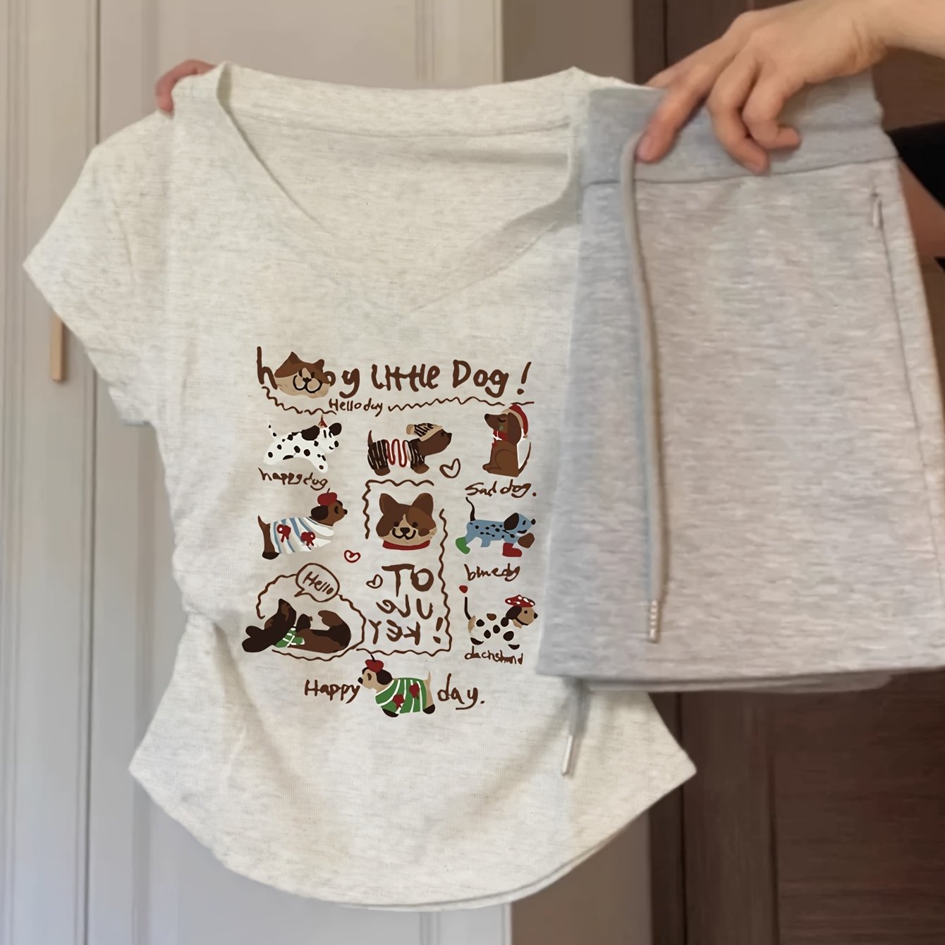 TEMU 여성용 캐주얼 V넥 반팔 티셔츠 "내 작은 강아지" 만화 애완동물 & 레터 프린트, 러플 밑단, 미디엄 스트레치, 세탁기 사용 가능, 사계절 활용 가능한 탑, 개 티셔츠, 비투명 소재, 부드러운 질감, 다목적 의류, 유쾌한 디자인, 여성 상의