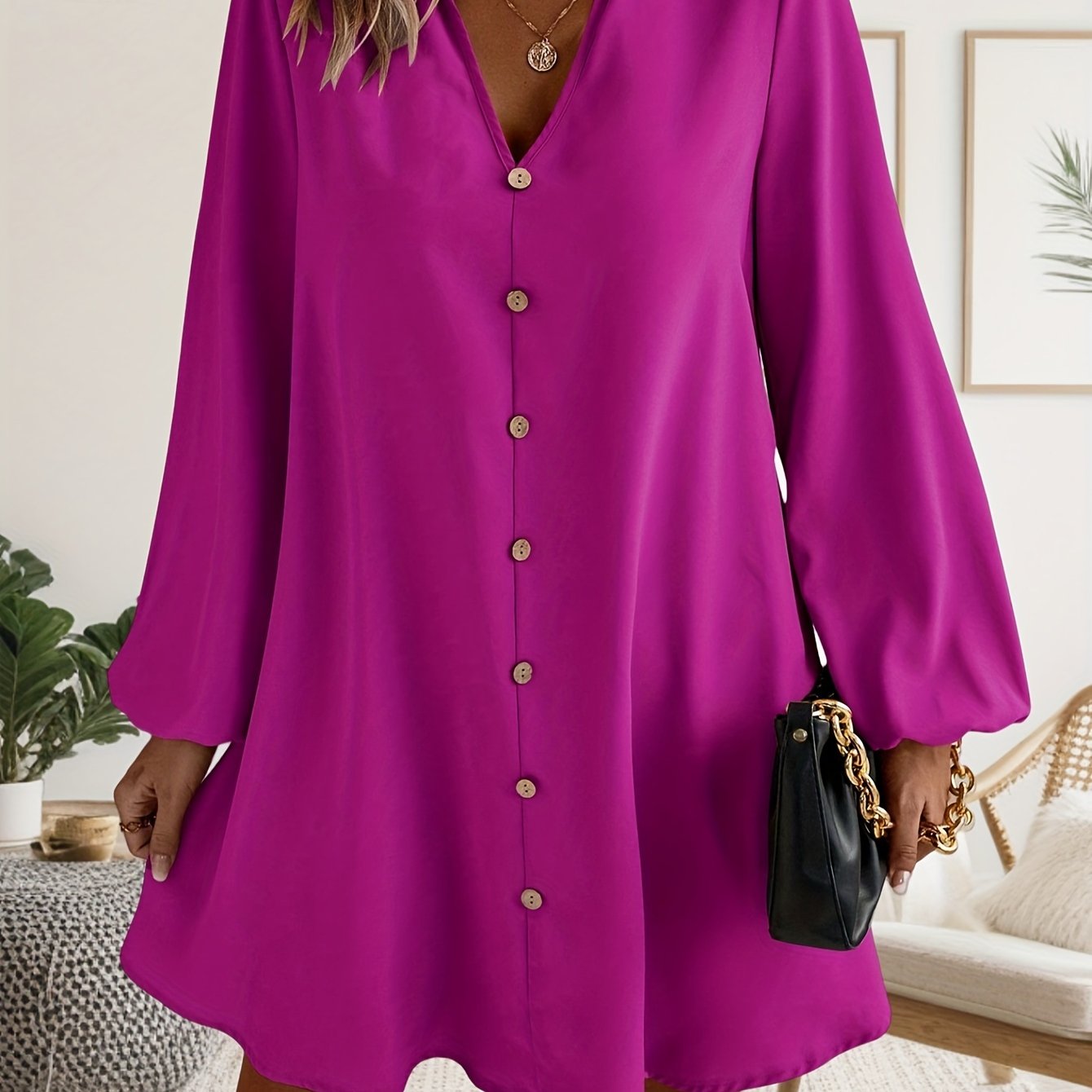 TEMU 향방향적인 우아한 여성 의류 7781 단색 V넥 싱글 브레스트 긴팔 드레스