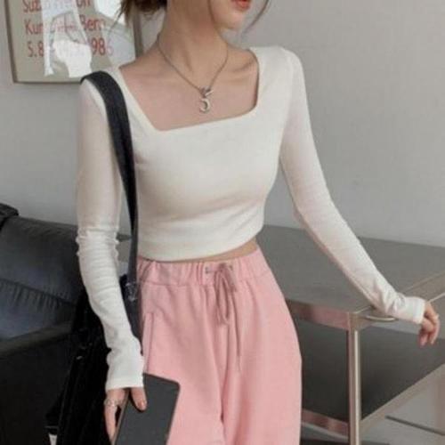 [셀러허브_여성트랜드패션]여자 여성 크롭티 티셔츠 롱슬리브 데일리 이너 스퀘어넥 흰티