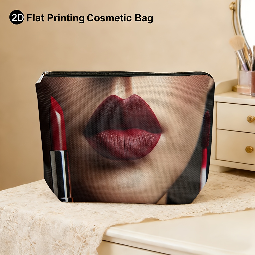 TEMU 1개 클래식 레드 립 정교한 패턴 휴대용 린넨 메이크업 가방 | 재사용 가능, 여성용 지퍼 욕실 가방, 야외 보관에 이상적, 여성 생일, 크리스마스, 새해 선물로 완벽|린넨