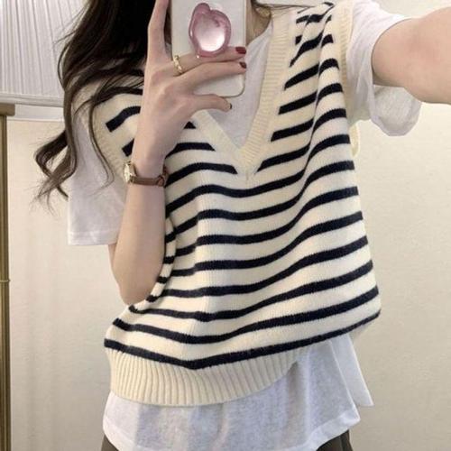 줄무늬 걸스 데일리 니트웨어 베스트 브이칼라 여성 울탑베스트탑 WFJIXSG