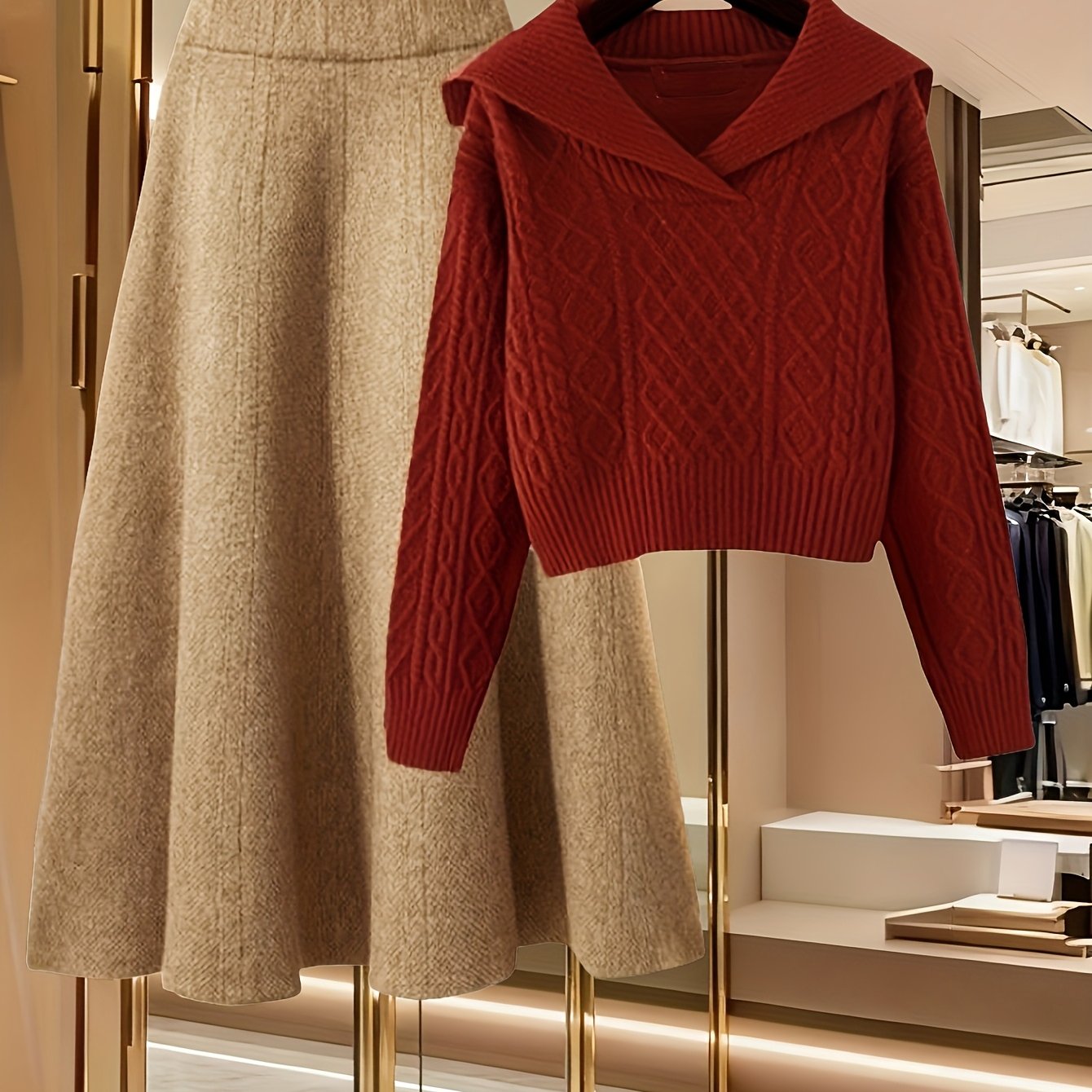 TEMU TD0909034는 인형 칼라와 하이웨이스트 A라인 스커트를 조합하여 아늑한 스타일을 특징으로 하며, 우아한 가을/겨울 투피스 의상으로 완성됩니다.