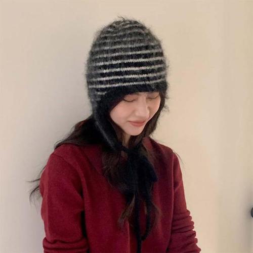 [신상오픈런]여성 이어플랩 라벨 스트라이프 부클 니트 겨울 비니 (41581326)