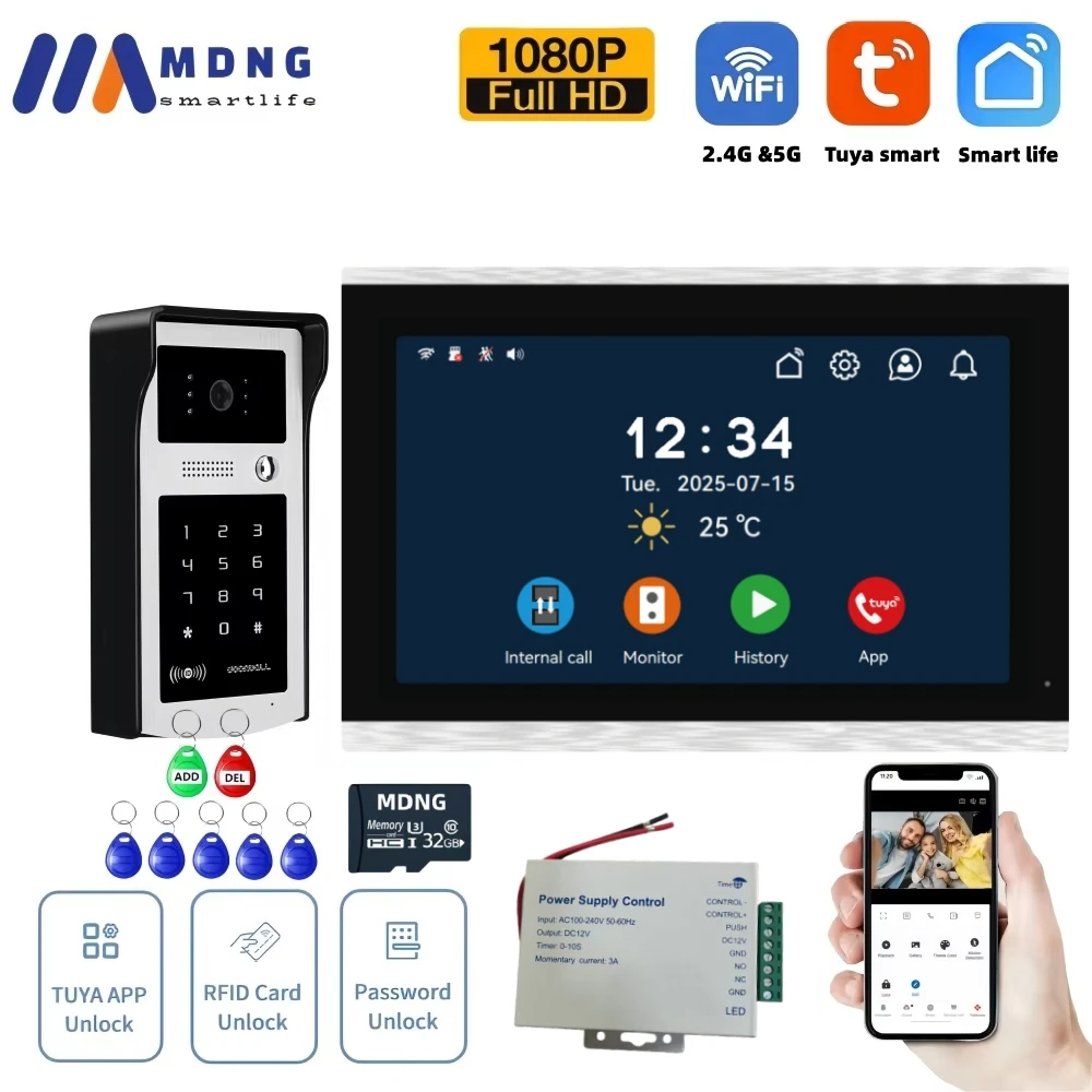7/10인치 투야 스마트 와이파이 비디오 아파트 인터콤 시스템 1080P 무선 도어벨 카메라 RFID 잠금 해제 도어 엔트리 인터콤 도어맨