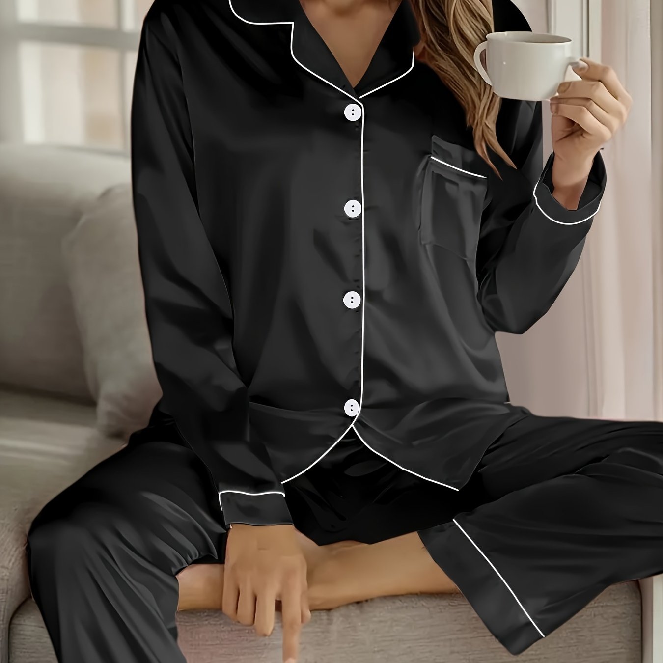 TEMU 여성용 새틴 캐주얼 편안한 1세트 2피스 파자마 세트, 턴칼라 긴팔 상의 & 탄성 허리 바지 여성 파자마 세트