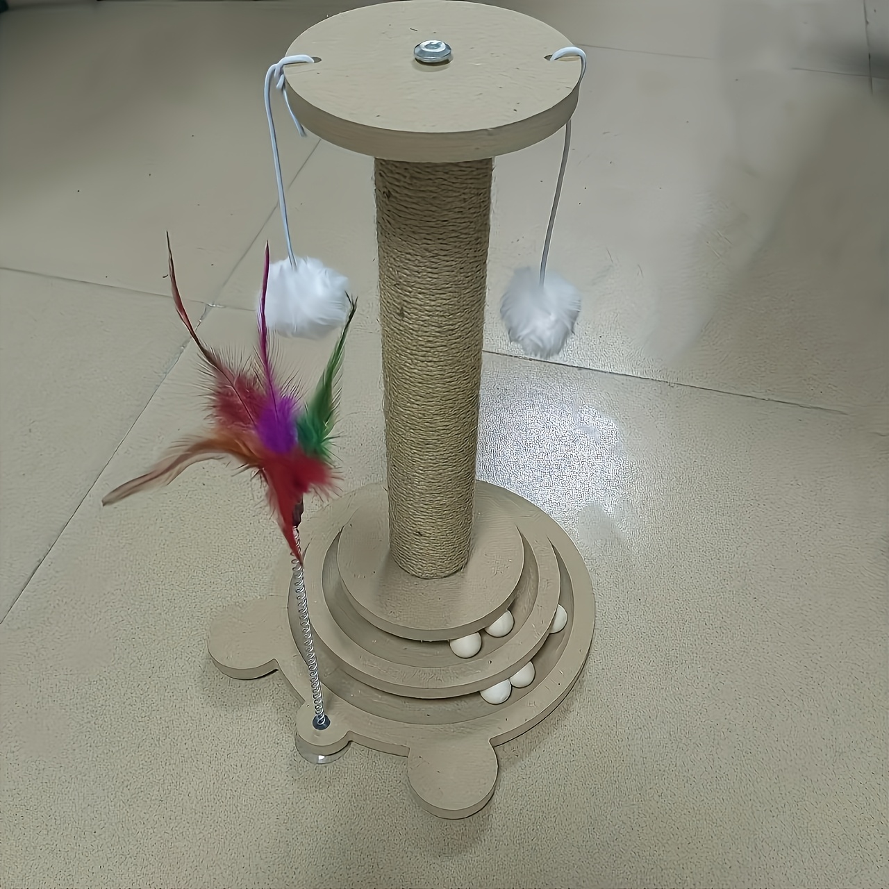 TEMU 회전식 베이스와 볼 장난감이 있는 인터랙티브 노란색 황마 고양이 스크래칭 포스트 - 튼튼한 하드 황마 발톱 연마기, 인조 깃털과 PVC가 포함된 행잉 장난감 포함