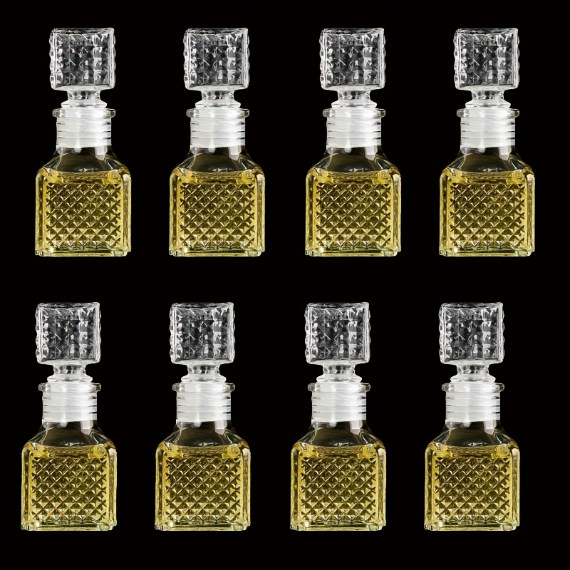 TEMU 8개 작은 사각 유리 병, 투명하고 조각되어 있으며, 외래 와인 병, 레드 와인 병, 유럽식 위스키 병, 향수 병 포함.