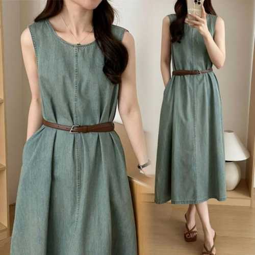 옷자락 / 여자 블루 일자핏 벨트포함 민소매 데님 롱 원피스