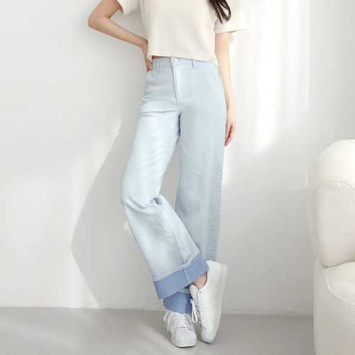 옷자락 / 여자 투톤 롤업 일자 와이드 빅사이즈 스판 봄 면바지