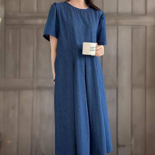 [신상오픈런]여성 빅사이즈 핀턱 반팔 뒷단추 데님 임부 롱원피스 (36294978)