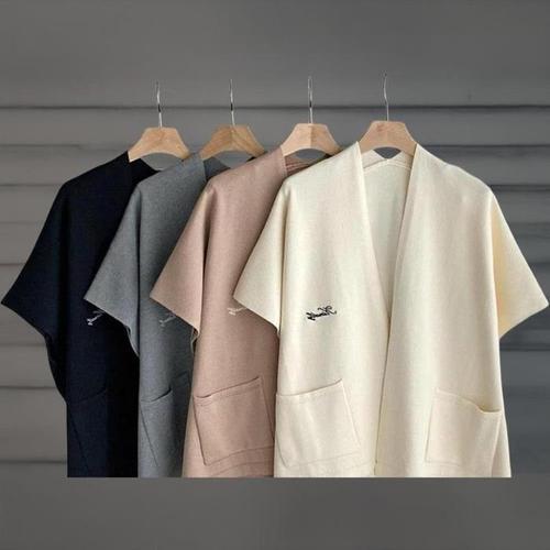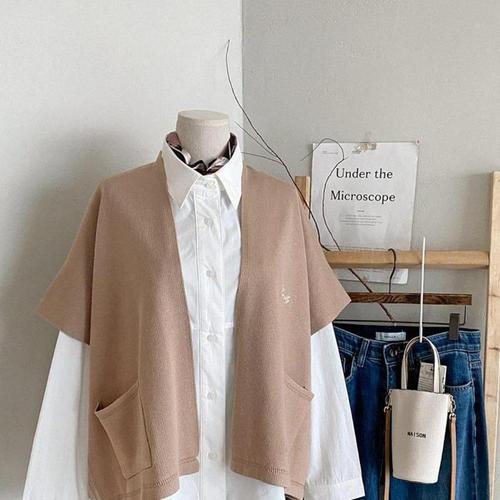 [옷자락]여성 자수 포인트 루즈핏 숄 반팔 포켓 가디건