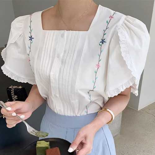 슈팅스타 / 플라워 자수 주름 퍼프소매 셔츠 블라우스 287145