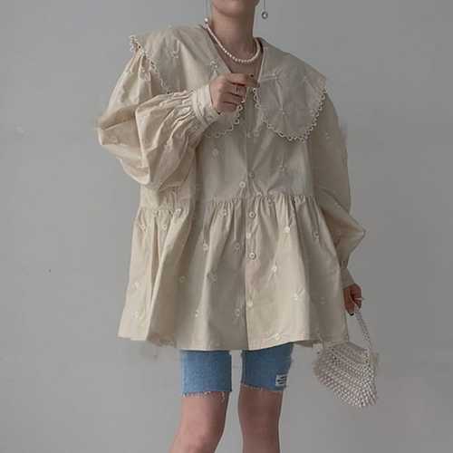 슈팅스타 / 레트로 빅카라 자수 여성스러운 시스루 블라우스