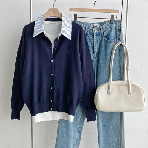 [신상오픈런]스트라이프셔츠 페이크카라 레이어드 자수 니트가디건 (30100473)