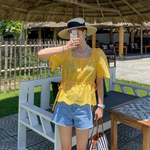 여성 봄 여름 레이스 칼라 자수 패턴 퍼프 소매 쉬폰 블라우스 W16