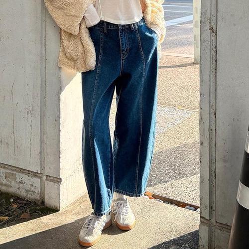 [신상오픈런]여성 절개 기모 커브드 와이드핏 워싱 청바지 (44092326)