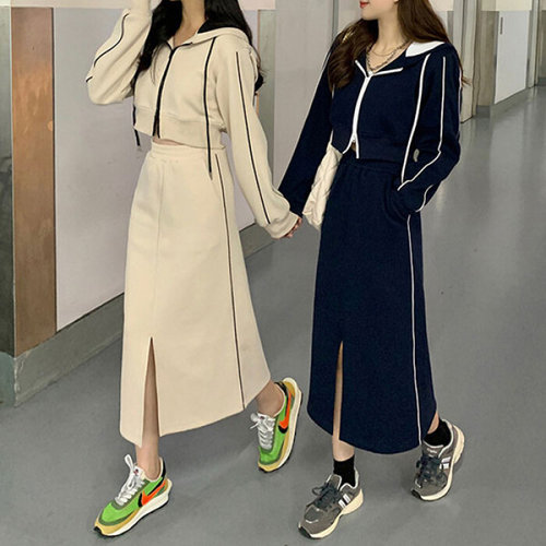 슈팅스타 / 크롭 후드 집업 + 절개 스커트 투피스 세트 3090087