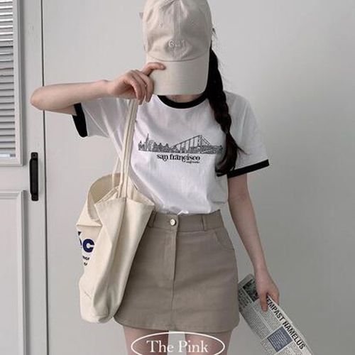 더핑크 / 제냐 루즈핏 배색 링거 프린팅 세미 크롭 반팔티